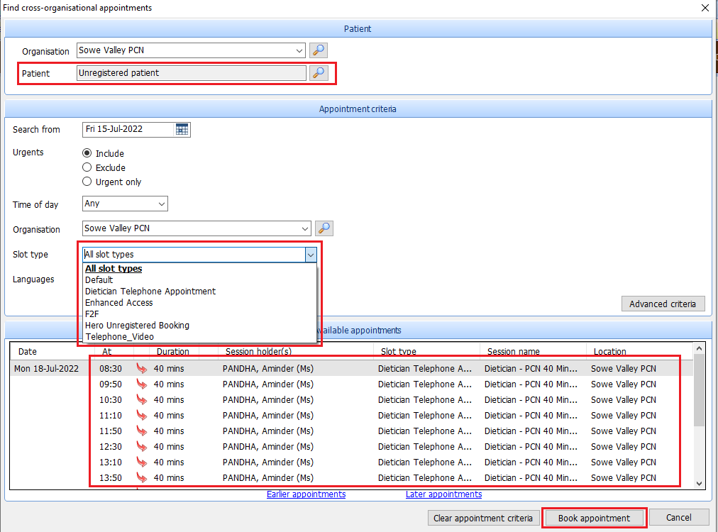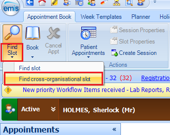 Find the patient you would like to book into the PCN Clinic and go to your Appointment Book. In the top left hand corner of the screen, select the ‘Find Slot’ drop down and then click ‘Find cross-organisational slot’.