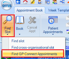 In the GP Practice, booking staff must be logged on with a Smartcard with the appropriate role to use GP Connect Appointments. In Appointment Book click on Find Slot > Find GP Connect Appointments: